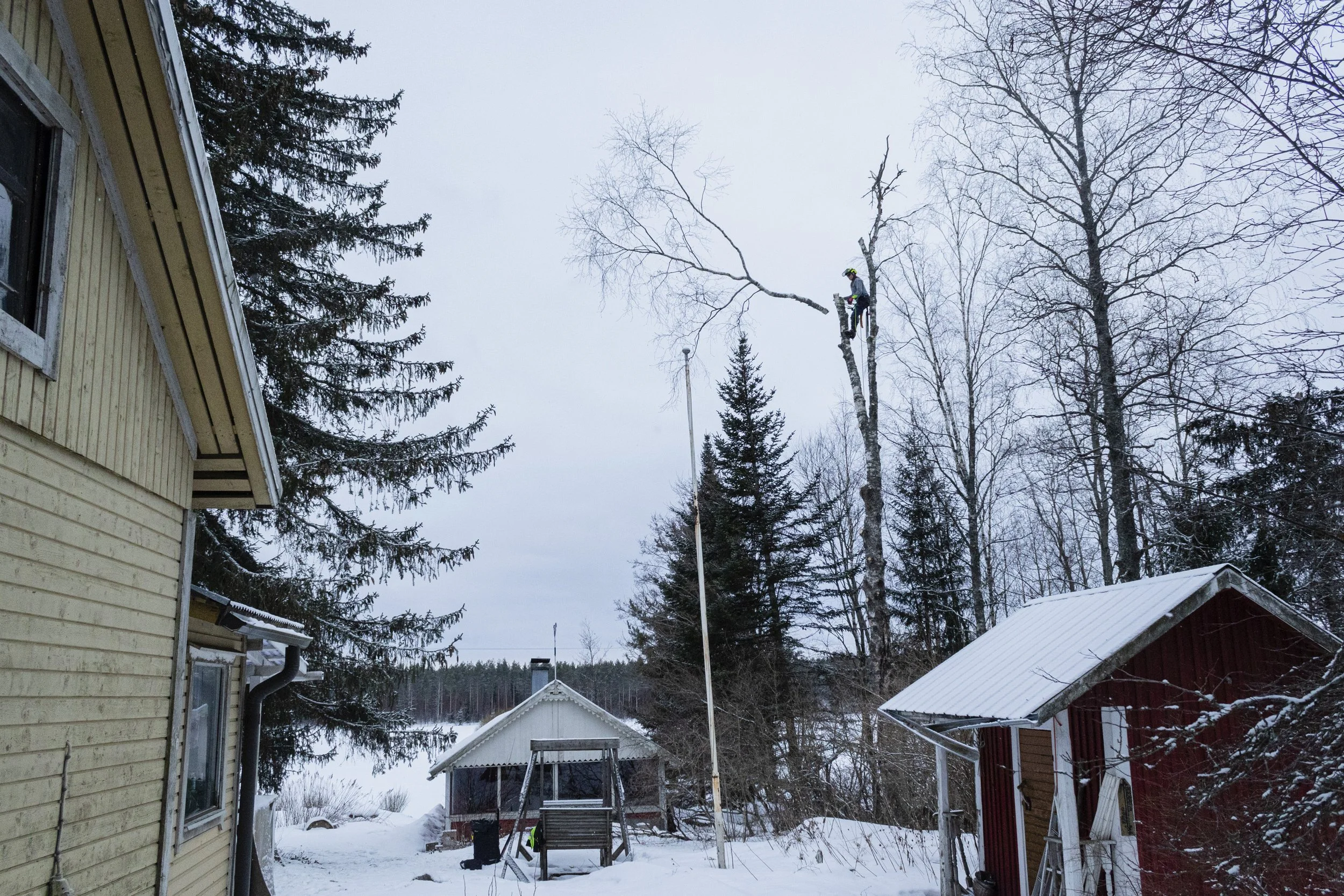 Alk. 60€Puiden leikkuu toteutetaan asetetun tavoitteen mukaisesti. Yleensä toimenpiteellä haetaan näkyvyyttä ja esteettömyyttä, turvallisuutta ja kestävää rakennetta. Kuvassa koivun oksia on typistetty antennin ja rakennuksen päältä luoden vapaata tilaa rakennuksen ympärille.